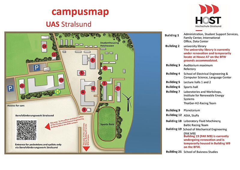Where you can find us: The heart of our school is building 19 on the university campus. During the renovation work on building 19, you will find us on the premises of the Berufsförderungswerk (BFW) in building W9.