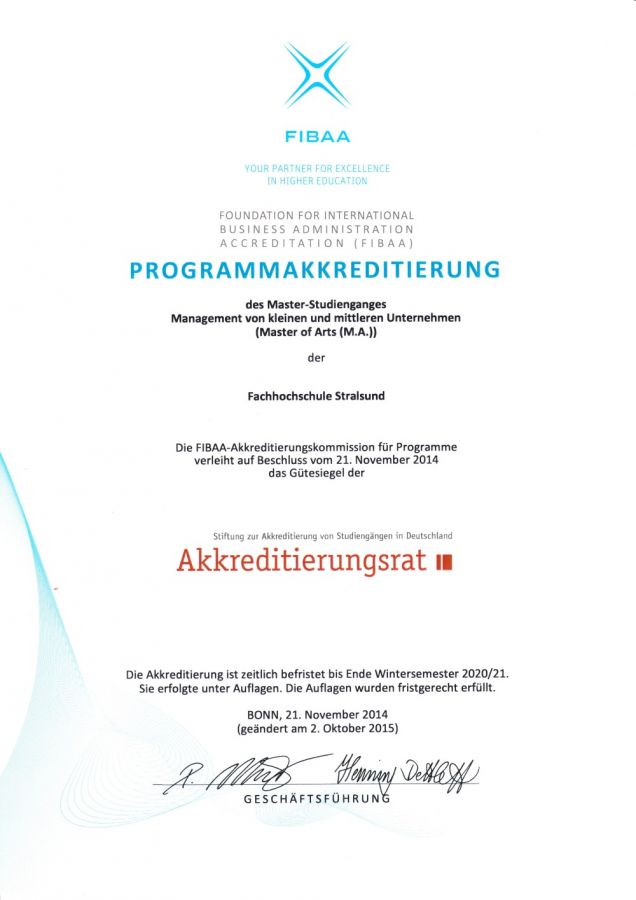Im Jahr 2021 wurde der Master-Studiengang "Management von KMU" vom Akkreditierungsrat vom 01.04.2021 bis zum 31.03.2029 erfolgreich akkreditiert.