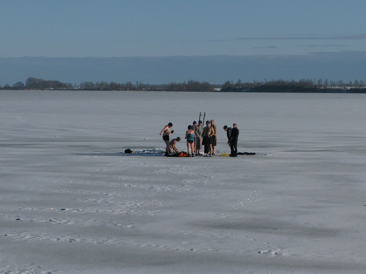 Zwar ist das Freisägen des Eisloches etwas mühselig, zumal das Eis immer dicker wird, aber der Spaß im eiskalten Wasser ist danach umso größer.
