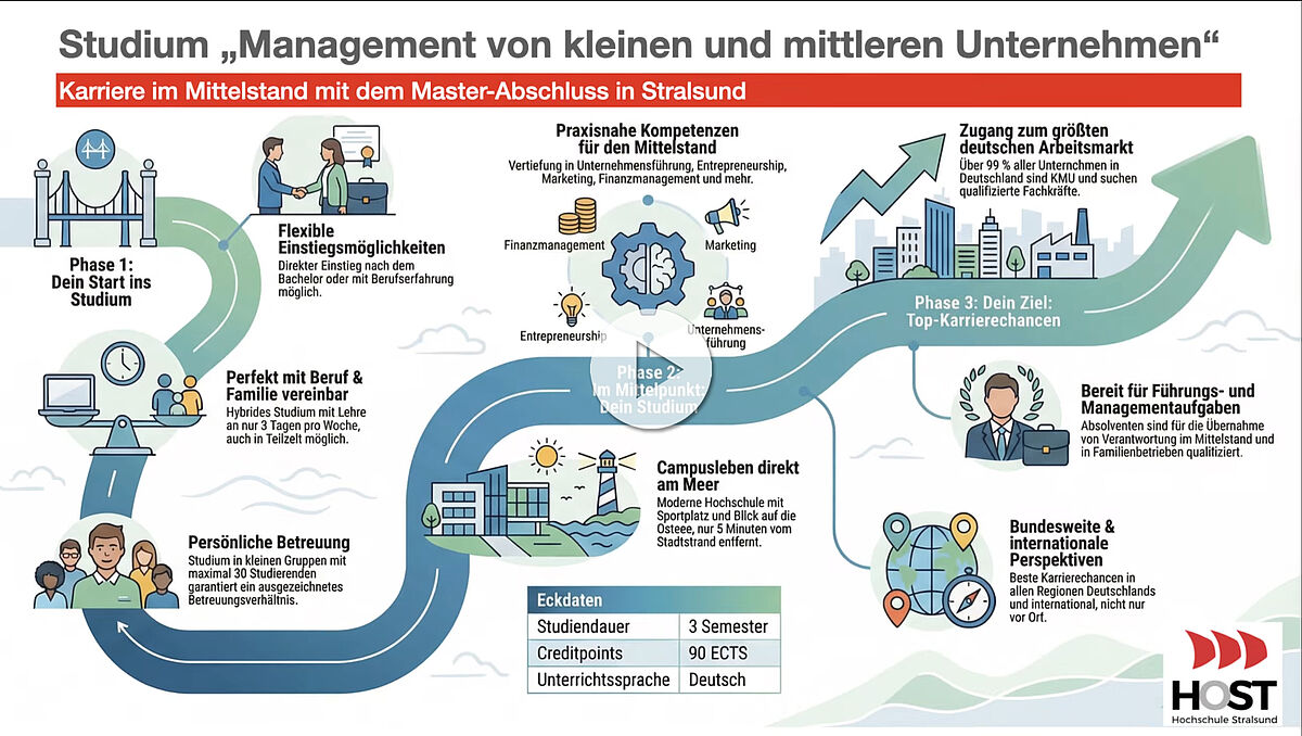 Ob Familienbetrieb, eigene Agentur oder Start-up: Eignergeführte, kleine und mittlere Unternehmen (KMU) sind das Rückgrat unserer Wirtschaft. Die Hochschule Stralsund hat das passende Studium dazu, die Besonderheiten im Management dieser Unternehmen kennenzulernen. Sie vertiefen Ihre BWL-Kenntnisse praxisnah und mit sehr guten Berufsaussichten an einem der schönsten Hochschulstandorte Deutschlands. Gerne informieren wir Sie an dieser Stelle über unseren akkreditierten Master-Studiengang Management von kleinen und mittleren Unternehmen. Wir sehen uns auf dem modernen Campus direkt an der Ostsee oder alternativ online! Denn jede Lehrveranstaltung wird als Livestream zu den Zeiten gemäß dem Semesterstundenplan übertragen. Die Lehrveranstaltungen finden in der Regel an drei Tagen in der Woche statt, sodass Zeit für eine berufliche Tätigkeit neben dem Studium bleibt.